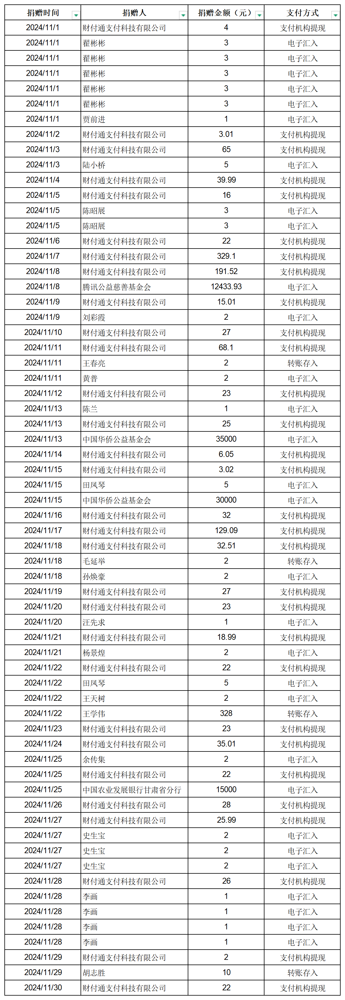 2024年張掖市慈善協(xié)會積極搭建愛心平臺,得到廣大愛心人士和愛心單位積極響應(yīng),踴躍捐款捐物,現(xiàn)將(2024年11月1日--11月30日)銀行轉(zhuǎn)賬收入公示如下: