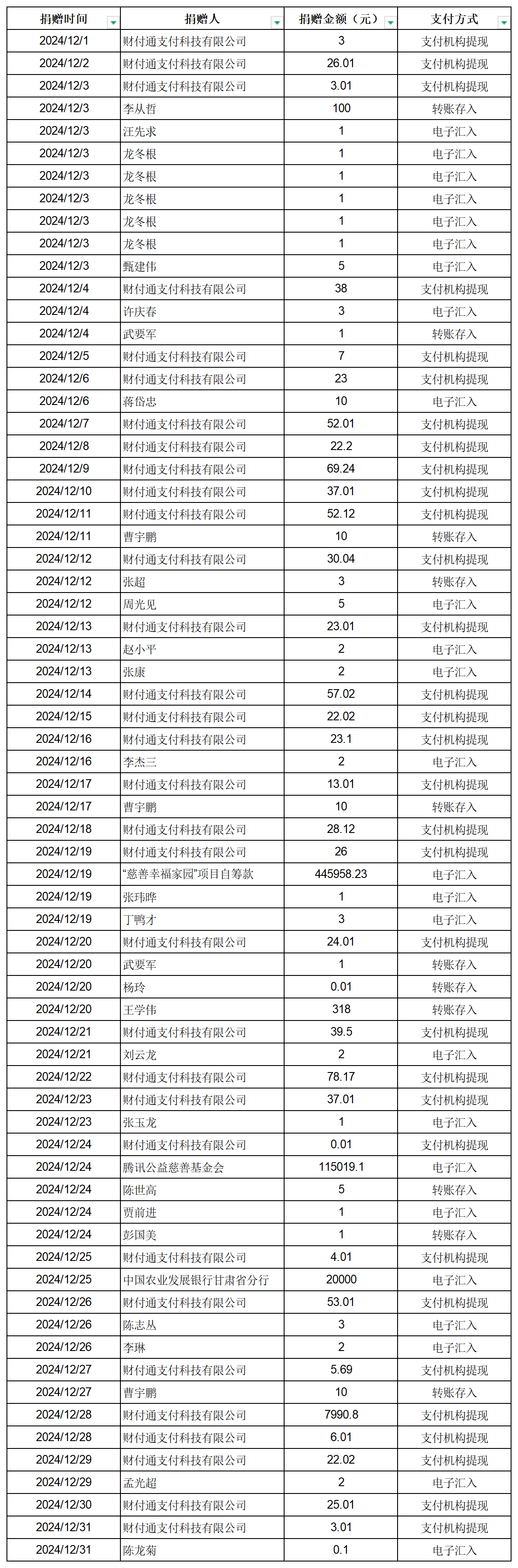 (2024年12月1日--12月31日)銀行轉(zhuǎn)賬收入公示如下: